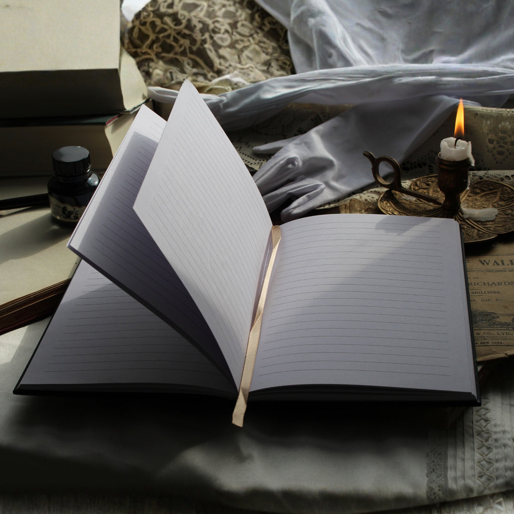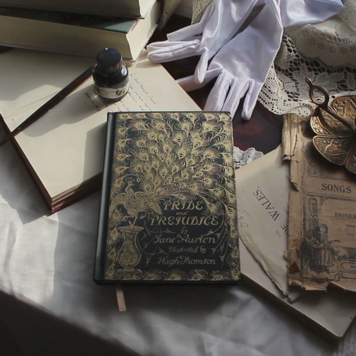 Celebrate your love of Jane Austen’s Pride and Prejudice with this elegant A5 hardback gold-foiled notebook. It features the original 1813 cover artwork by Hugh Thomson, recreated in luminous gold foil. Inside, the opening pages are adorned with a delicate Regency-themed pattern inspired by the illustration—teacups, fans, books, and peacock feathers—subtle enough for everyday notes yet rich with literary charm.