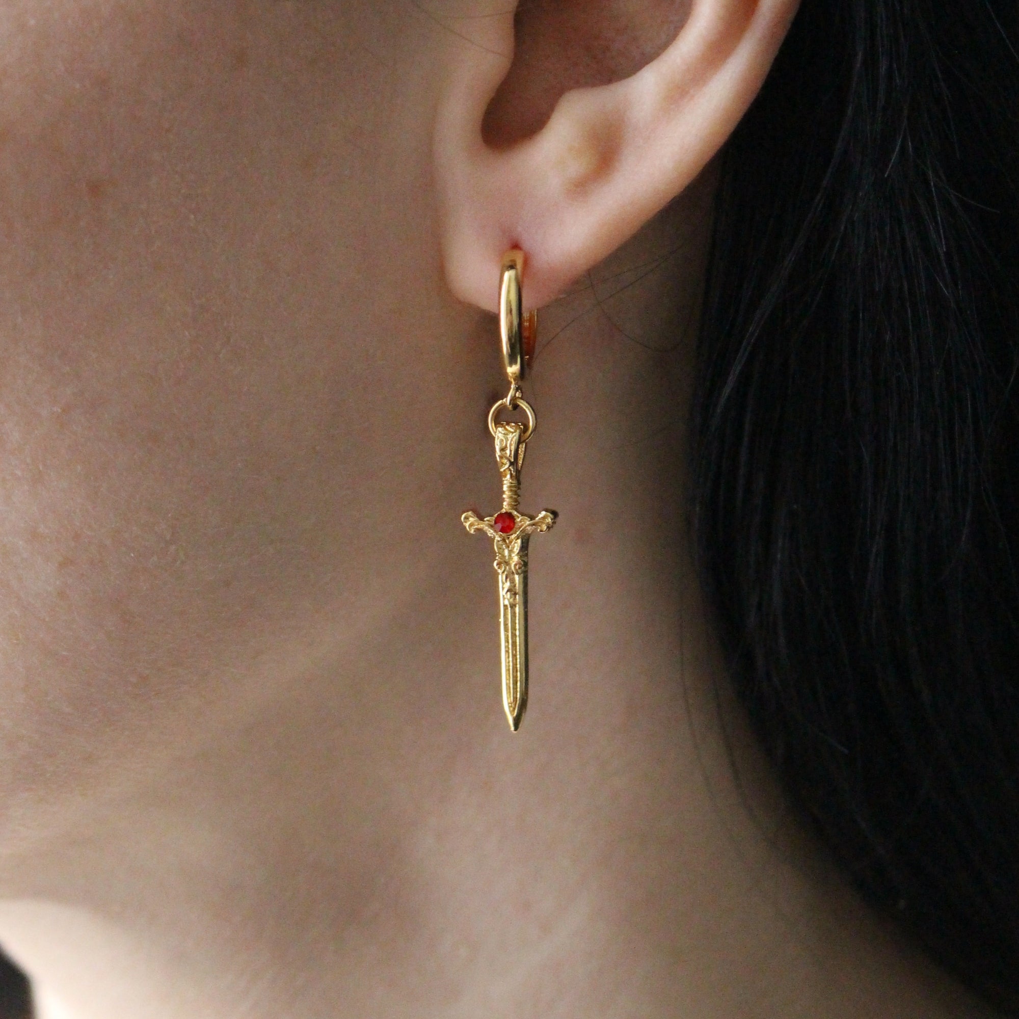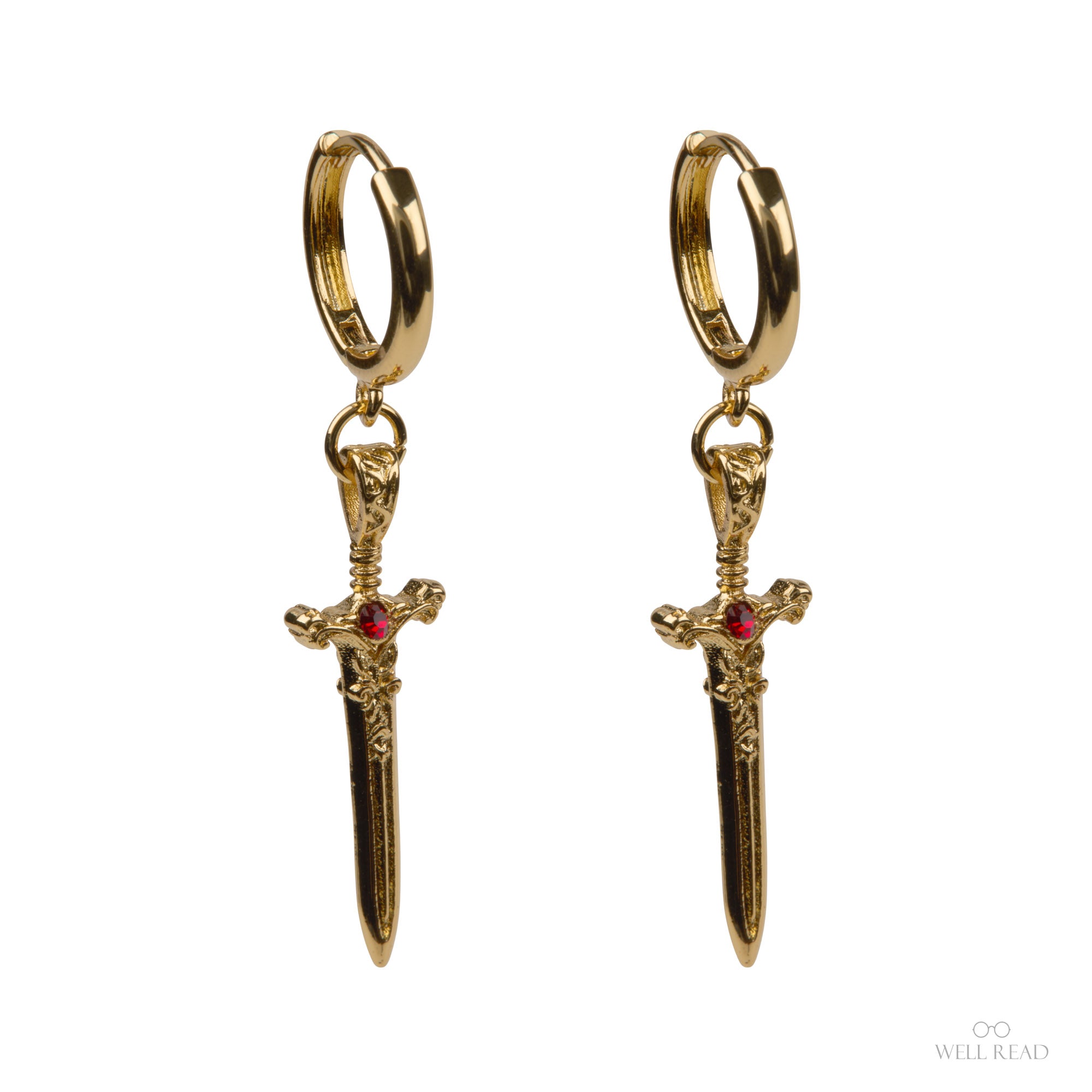 Each earring suspends a finely cast gold-plated sword charm: a slim blade etched with storybook filigree, a scrolling crossguard, and a crimson stone set at the center. Hanging from sleek hoops, they balance mythic drama with everyday elegance—an ideal companion to our The Dragon Sword Chronicles book crossbody bag.