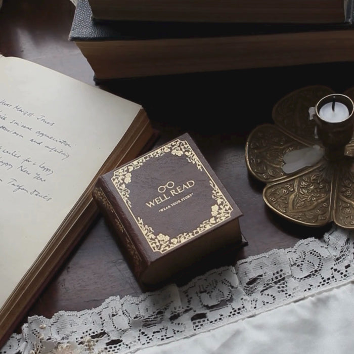 This charming, book-shaped jewellery box is the perfect home for your bookish necklaces. Its vintage-inspired design protects your jewellery and serves as a decorative piece. The luxurious velvet interior keeps your necklace tangle-free, whilst the exterior resembles a classic novel with intricate gold detailing. An ideal gift for book lovers and jewellery enthusiasts alike.
