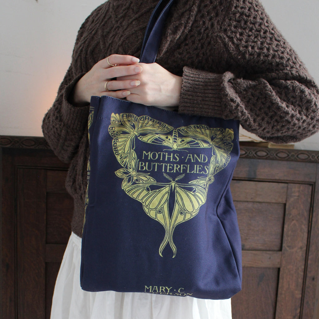 Our striking collection of crossbody bags, zip-around purses, and coin purses makes for an extraordinary gift for any lover of nature and literature, or even as a special treat for yourself. These exquisite accessories, adorned with beautiful illustrations of moths and butterflies set against a navy faux leather backdrop, are inspired by Mary C. Dickerson's book 'Moths and Butterflies'. Perfect for any occasion, this unique collection is sure to enchant fans of entomology, poetry, and art