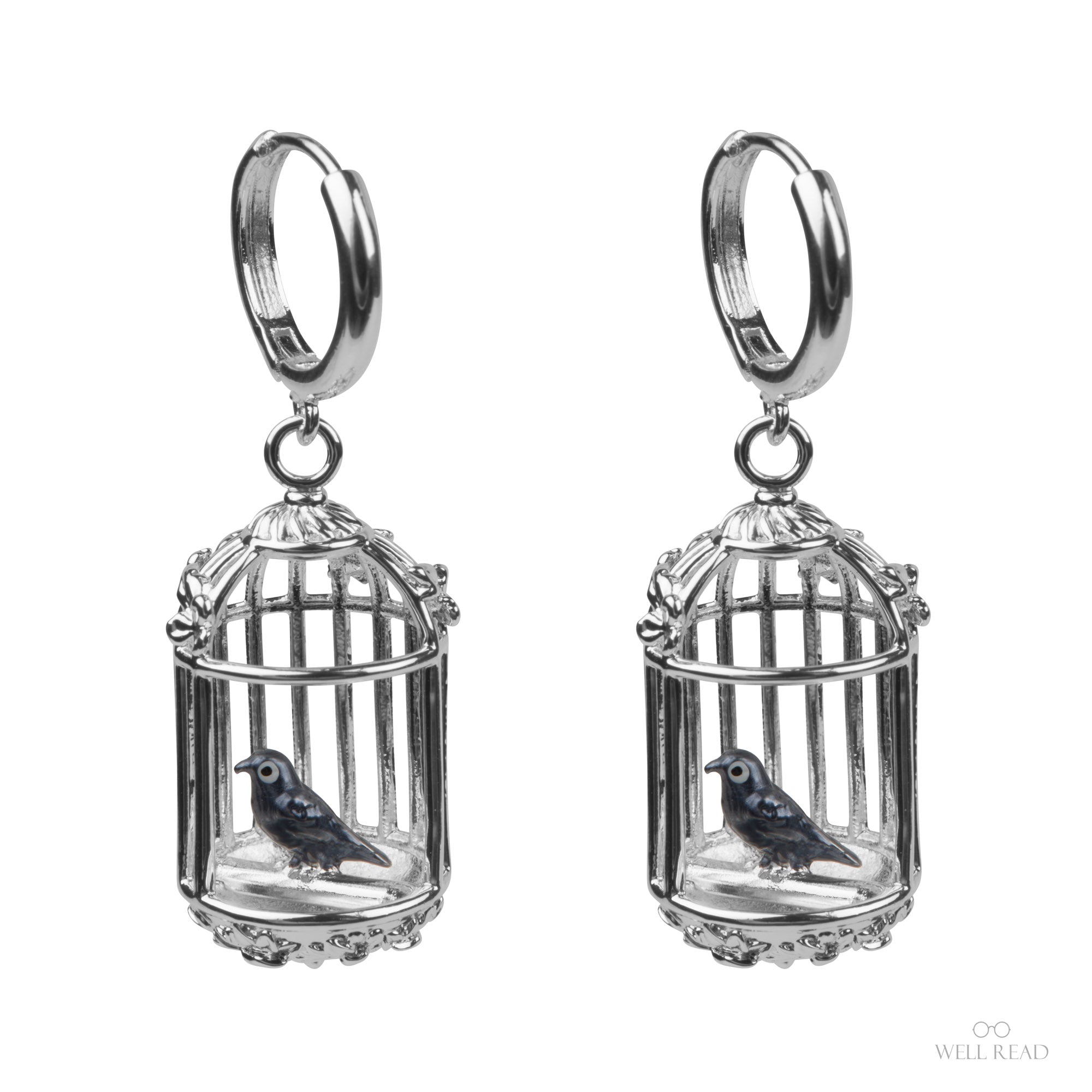 Introducing our Jane Eyre–inspired birdcage silver hoop earrings—a romantic homage to Charlotte Brontë’s classic. Each earring suspends a finely wrought silver birdcage charm cradling a tiny blue enamel–painted bird—an elegant nod to Jane’s declaration, “I am no bird; and no net ensnares me.”