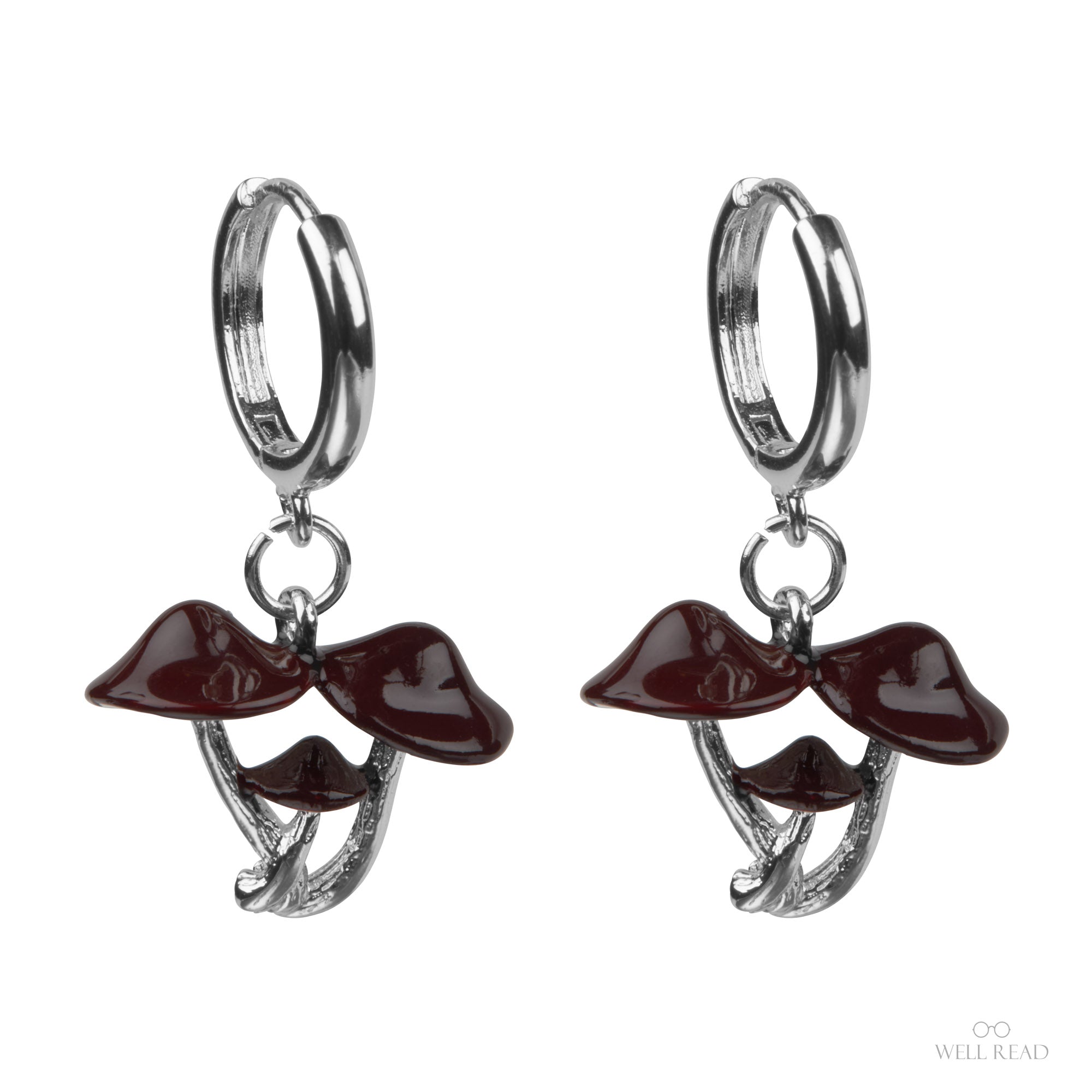 Introducing our Secrets of the Forest Floor mushroom silver-plated hoop earrings—a woodland daydream with a touch of whimsy. Each earring features a tiny cluster of three toadstools, their caps finished in a rich, earthy-red enamel that glows against cool silver tones.