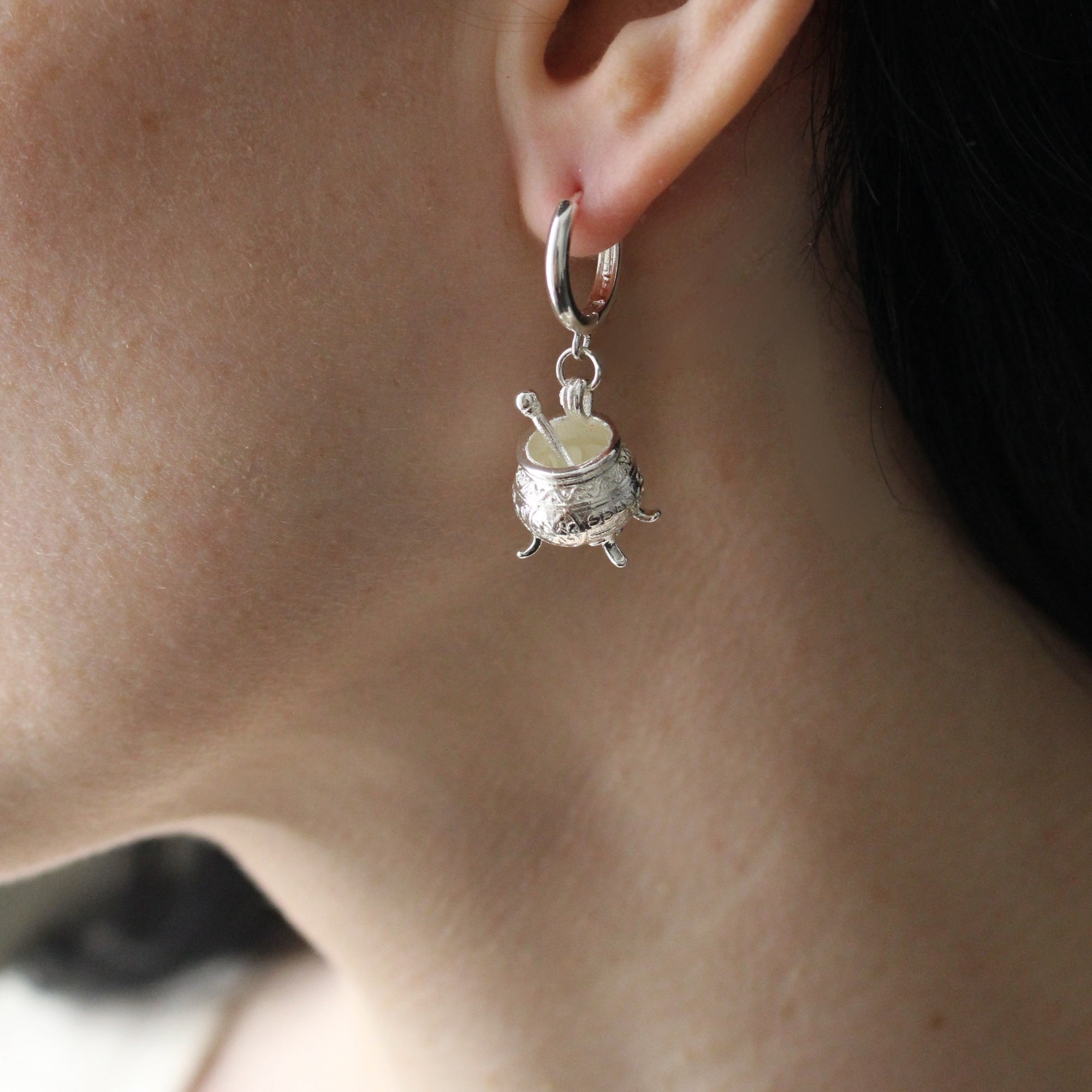 Each earring suspends a miniature silver cauldron charm from a slim hoop—complete with tripod feet and a tiny stirring spoon poised at the rim, as if paused between clockwise and counter-clockwise turns. Rich texture lends the look of well-loved silver from a lamplit, cobbled-lane shop, yet the finish keeps a refined gleam. Lightweight and easy to wear, they style beautifully with crisp collars and cardigans, and pair perfectly with our The Encyclopedia of Potion Making book crossbody bag.