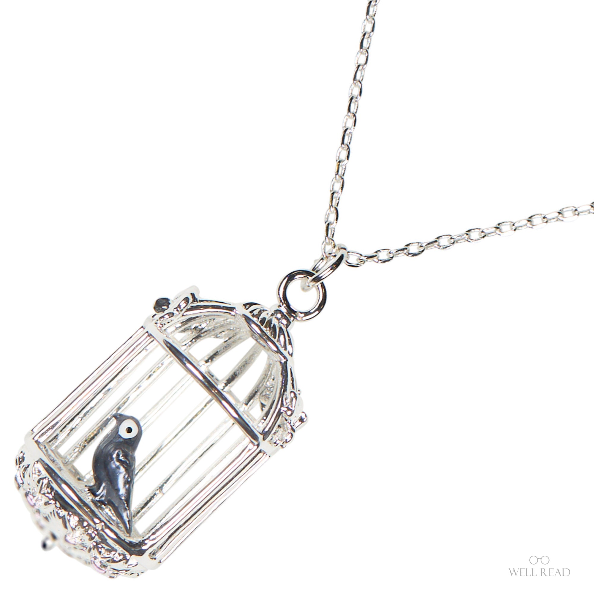 Introducing our Jane Eyre–inspired silver birdcage pendant necklace, a romantic homage to Charlotte Brontë's classic. This delicate piece features a finely wrought silver cage cradling a tiny blue enamel painted bird—an elegant nod to Jane's famous declaration, "I am no bird; and no net ensnares me."