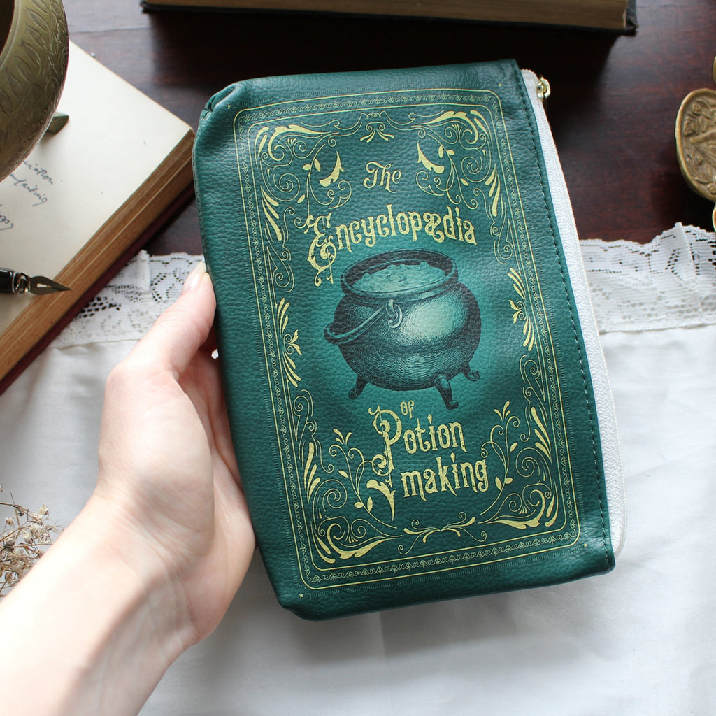 Our striking collection of crossbody bags, zip-around purses, and coin purses makes for an extraordinary gift for any lover of the mystical and literary worlds, or even as a special treat for yourself. These exquisite accessories, adorned with beautiful illustrations of ornate gold detailing on a dark green background inspired by 'The Encyclopedia of Potion Making', perfectly capture the old-world, magical essence of potion making. The front features a central illustration of a cauldron, while the back showcases a potion vessel bottle, adding to its apothecary allure.