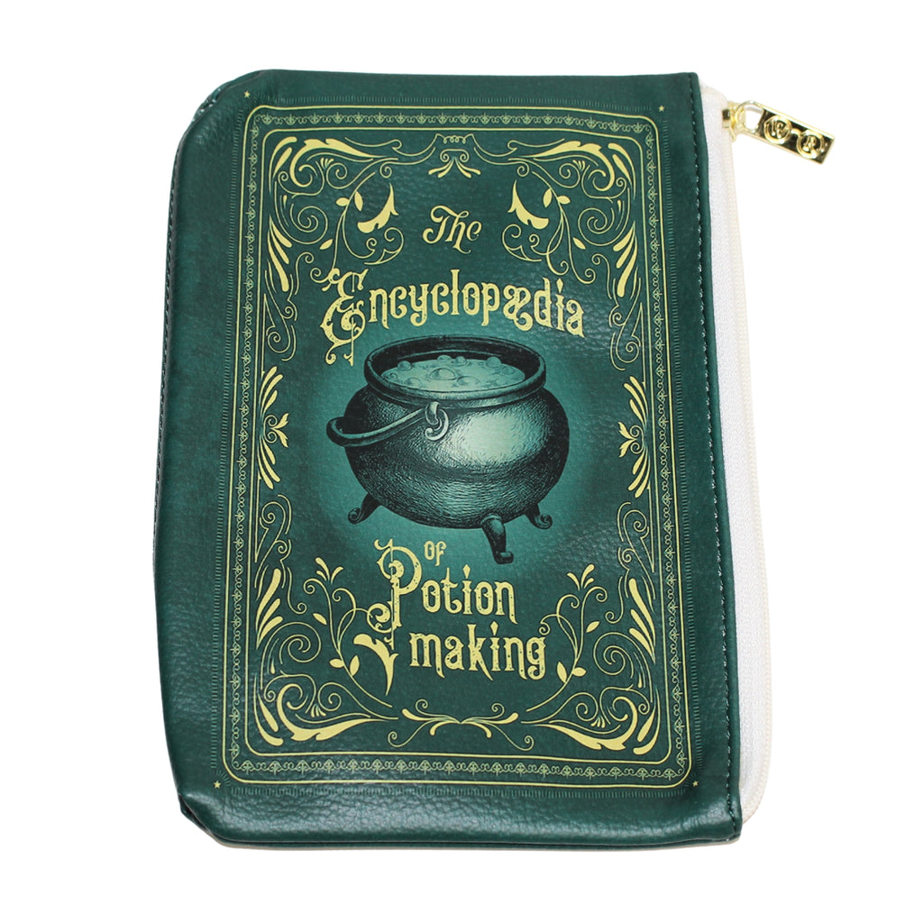 Introducing our 'The Encyclopedia of Potion Making' zip around wallet purses, designed to capture the enchanting essence of the mystical world. Inspired by the magical allure of potion making, the intricate gold detailing adorns a sophisticated dark green faux leather backdrop. A striking cauldron design graces the front, while a potion vessel motif adds charm to the back.